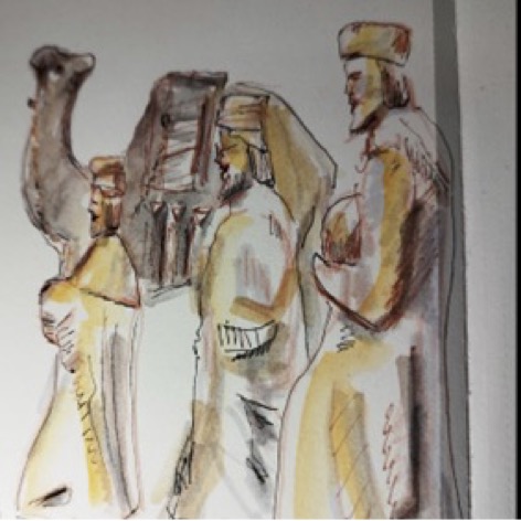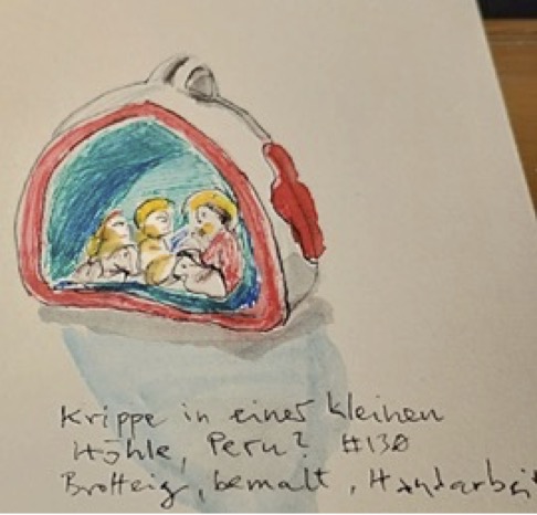 Manche Besucher sind begeistert von der Vielfalt der unterschiedlichen Krippen und Ländern ihrer Herkunft. Manche sammeln selbst Krippen oder einzelne Engelfiguren und holen sich Anregungen für ihre eigene Sammlung. Wieder andere freuen sich über die Schönheit der Figuren und skizzieren einige davon in ihr persönliches Reise- bzw. Tagebuch. So malt eine Dame mit dem Namen Marta die folgenden zwei Bilder in ihr Tagebuch: